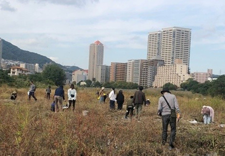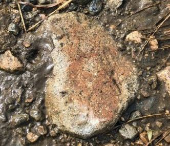 | 宝塚市を流れる武庫川河川敷には、上流から流れてくるいろいろな石が見られる。 特に、丹波帯の堆積岩類や有馬層群の流紋岩類を初め、六甲層群の花崗岩類な どが多く見られる。ここの花崗岩はカリ長石が多く含まれていて赤味を帯びている。 場所は、公民館前から少し下った河川敷。 |