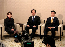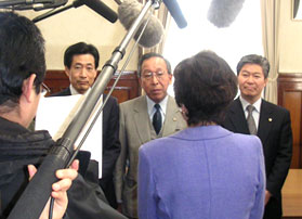 2期目の任期が始まる2月6日、太田知事はライトブルーのスーツで初登庁。中村議員ら民主党・公明党・自民党各議員団の3役、府庁幹部らが拍手で出迎えました。 またこの日、太田知事は正副議長への挨拶の後、民主党議員団室を訪れ、「課題が多い4年間なので、しっかりと頑張りたい。ぜひご指導・ご鞭撻をお願いしたい」と挨拶しました。 この日は初登庁日とあって、写真(左)のように報道陣がいっぱいで、お互い少し緊張気味でした。 | |||