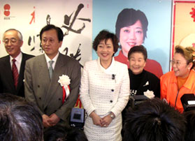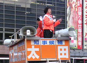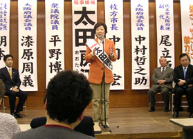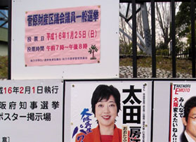 注目の知事選挙は太田房江さんが当選。投票の1週間ほど前から新聞などの世論調査で、他候補を圧倒しているという報道が行われましたが、予想どおりの結果になりました。 中村議員ら民主党11区所属議員は、ポスター貼り・ビラ配布・電話かけなどの様々な行動に取り組んできただけに大喜び。これからは、選挙時の公約実現に向けて、知事に注文を付けていかなければなりません。皆さんから、府政運営についての声をぜひお聞かせください。 | ![]() | ![]() |