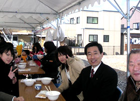 ![]() 地元の餅つき大会で 「特製のトン汁とお餅」をいただく中村議員 |