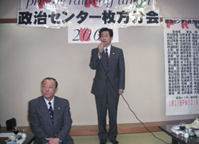 地元選出の参議院議員・高嶋良充氏を囲む地域懇談が「杉」地域で開かれ、中村議員も出席しました。 高嶋議員が98年夏に参議院議員に当選してから早くも5年半が経ちました。この日の懇談会では、「口先だけの小泉内閣では日本は駄目になってしまう。しっかり頑張りたい」と語る高嶋議員を更に力強く支えていこうと、地域あげての取組みを約束しました。 2月28日には高嶋議員を励ます集いが枚方で開催され、中村議員もその呼びかけ人になっています。 |