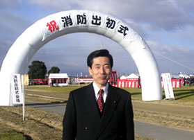 ●消防出初式 枚方寝屋川消防組合(常備消防)と枚方市消防団、寝屋川市消防団の恒例の合同出初式が1月11日、寝屋川市内の淀川河川敷き・太間公園で開かれました。 | ![]() 出初式会場入り口で | ||