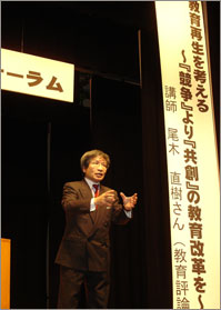 学力問題が大きく取上げられる中、北河内地域の教育政策フォーラムが11月29日、枚方市内で開かれました。 テーマは「教育再生を考える〜競争より共創の教育改革を〜」で、教育評論家の尾木直樹氏が約2時間にわたって、政府が進めている教育改革がいかに問題を抱えているか、どこに問題があるかを分析しました。 子ども達が日々の生活の中で、【1】発想力、【2】論理力、【3】挑戦的思考力、【4】表現力、【5】コミュニケーション能力を身につけていくことが学力を向上させ、日常生活の中で活用できると具体例をあげながら熱心に説明しました。 中村議員をはじめ、参加した市議会議員、PTA関係者、教員、組合員ともに「真の教育改革はどうあるべきか」を教えていただいたと述べていました。 |