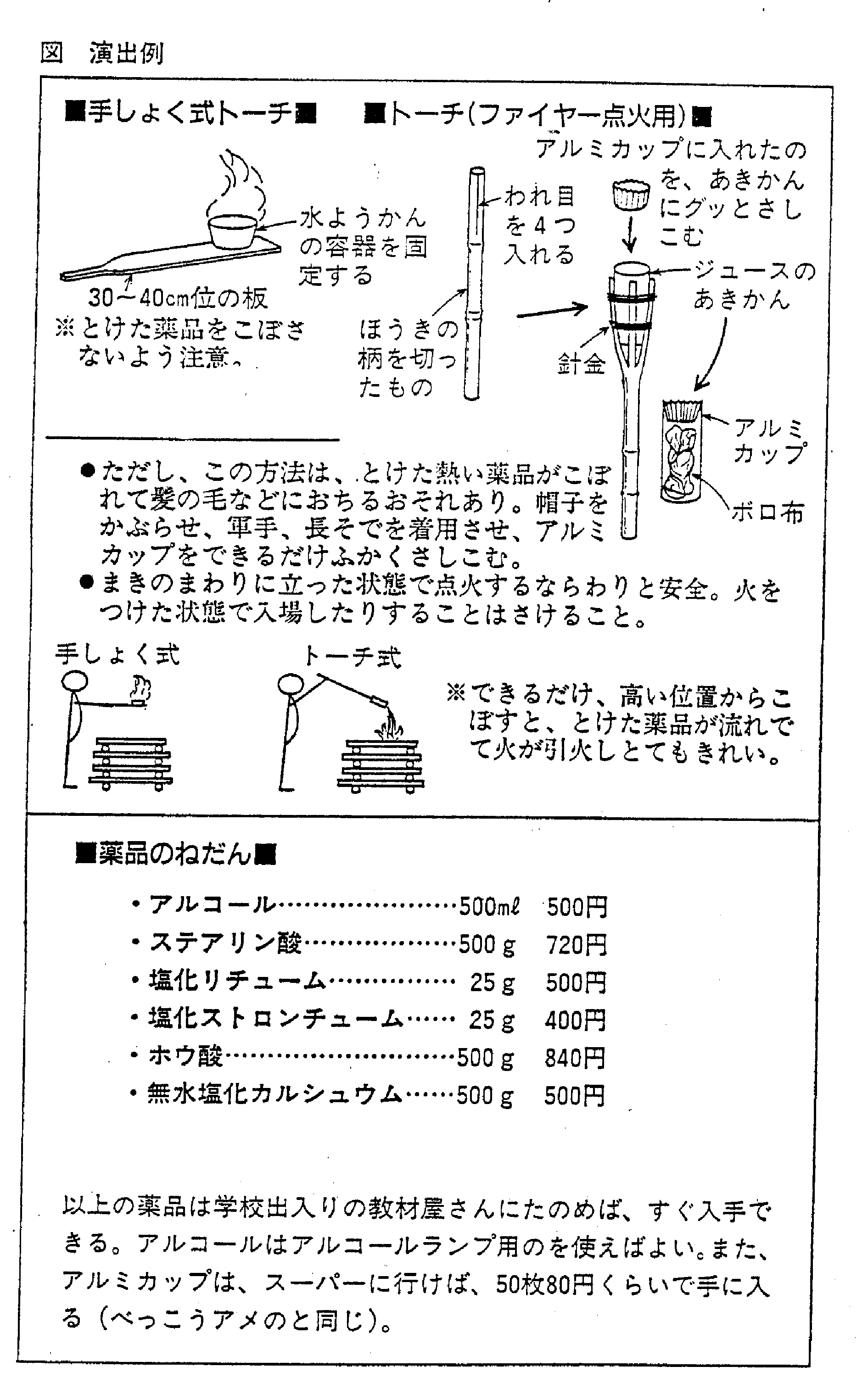 ぼちぼち、林間学校や臨海学校の時期ですね。こういった行事にかかせないものと いえば、もちろん、キャンプ・ファイヤーです。 普通、学級のだしものに重点がおかれ、点火といえば、トーチでオーソドックスに 火をつける、といったケースが多いようですが、この部分の演出を工夫すれば、ぐっ とムードが盛り上がり、子ども達の心にいつまでも残るような印象深いキャンプ・フ ァイヤーにすることができます. その一つの方法として、今回は炎色反応を利用した「カラーファイヤー」を紹介し てみましょう。ずばり、その名の通り炎に緑や深紅や青や黄の色をつけるのです。 材料の薬品は、学校出入りの教材屋さんに言えば、すぐ手に入ります。劇薬はあり ませんし、安価です.(全部で2500円ぐらい) ■使用薬品と分量 アルコールランプ用のアルコール(50cc)+ステアリン酸(3g)+発色剤(3g) ※発色剤は、出したい色によって、・次の薬品の中から選ぶ。 ・緑色…ほう酸 ・黄色・・・せっけんを細かく削ったもの ・深紅…塩化リチュームか塩化ストロンチューム ・橙色…無水塩化カルシウム ※緑と深紅がきれいなので、この2色だけでもいいと思います。 ※蛇足だが、上の写真左端の女の子、現在、全日本女子バレーボール選手の 中野由紀(東洋紡)。当時小学校5年生。 ■作り方 (1)アルコール、ステアリン酸・発色剤を100ccのビーカーに入れる(入れる 順序はどれからでもよい)。そして、500ccのビーカーかカップメンの容器な どにかなり熱くしたお湯を入れ、その中につけて(つまり湯せんするわけです )、箸か何かで透明になるまで静かにかき混ぜます。(蒸気を吸わないように) (2)透明になったら、アルミカップ(8号くらい)を二枚重ねにした物に移して そのまま15分ほど置いておくと、冷えて全体がゲル状になります。それでで きあがりです。 (3)何色も作る時は、色がまじる恐れがあるので、そのたびにビーカーや薬匙を 取り替えます。または、1回ずつ洗います。 (4)できた物をアルミカップのまま、次の図のように、竹で作った空き缶トーチ の先につめます。(少し薬品がはみ出すかもしれません。その時は、拭き取っ ておく)そして、キャンプファイヤーが始まるまで、どこかにまっすぐ立てか けておきます。 私も何回も行ないましたが、とてもきれいで感動的で子ども達に大好評でした。
