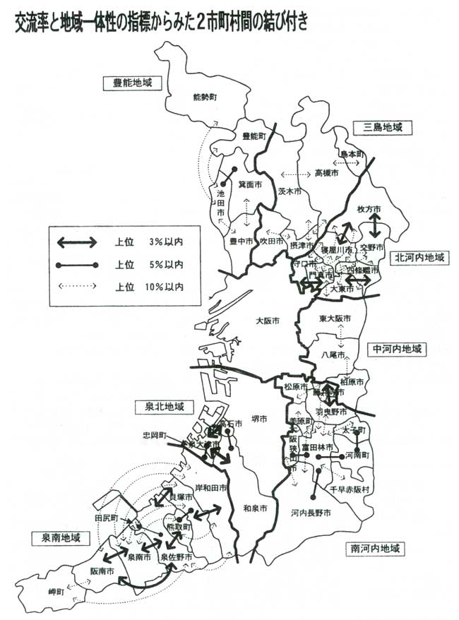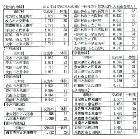 | 地方の借入金残高は1999年度未で約176兆円、国地方を合わせた債務残高は、約600兆円(対GDP比 121%)にのぽります。 一般的に小規模市町村ほど税財政基盤が弱いなかで、本年4月の介護保険制度の導入でさらに市民から 高度な行政サーピスが求められています。 地方行政の責任が一段と重くなり従来の市町村単位では適切な対応が難しい状況にあります。 また、交通・情報通信の発達や経済活動の進展で市民の日常生活圏は市町村の領域を越え広域的な 行政サービスの提供が不可欠になっています。 そのために現行の市町村の行政体制を見直し可能な限り拡大、合併する必要があります。 合併は広域な視点からの街づくり、効果的な道路や下水道等の基盤整備、行政の効率化とマンパワーの 充実、議会のスリム化などのメリットがあります。 ところが総論は賛成でも、職員、議員数の削減など具体化するにつけ懸念の声が大きくなります。 新市役所の場所、名前をどうするかでセクト意識がはたらき難航している例もあります。 そうしたなか国は昨年7月16日、市町村の合併の特例に関する法律を改正し、都道府県に対し合併推進の ための情報の提供や助言をおこない市町村合併推進要綱の作成を要請しました。 大阪府でも懇話会を設置し、住民アンケート、市町村長の意向確認、市町村の合併パターンの具体的な 検討を行っています。 地方分権からいえぱ合併の推進は国や府の指導を待つまでもなく市町村が主体的に取り組むことと 住民側の積極的な参加意識がなけれは成功しません。 いままで市民発議から合併が実現した例はなく、住民か街づくりや行政サービスについて、単なる賛成・ 反対や要望するだけでなく自ら参加して行政とともにつくり上げていく意識が欠かせません。 市町村合併の議論を通じて住民が行政に参加できるチャンスと捉えるべきです。 議席が確実に減少する議員も市民の代表として勇断をもって対応する必要があります。 その延長線上に、都道府県制を見直した道州制が見えてくると思います。 客観的2市町村間の結び付き(交流率と地域的一体性の指標)
