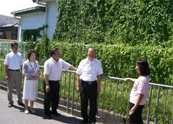 ![]() 【写真】樟葉幼稚園のみどりのカーテンを視察、 右から前川園長、鈴木、垣見、長田府議、小野市議 |