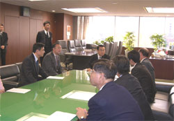 引き続き、枚方東ICまで開通している第2京阪道路を門真市まで一日も早く開通させるため、第2京阪道路建設促進議連で12月6日、国土交通省の冬柴鐵三大臣、峰久幸義事務次官、谷口博昭技監のほか、政務官、審議官を訪ね、要望を行いました。中之島高速鉄道鰍ヘ、平成15年春から着工している中之島新線工事でシールドトンネル工事が10月31日に全区間貫通したことから、鉄道施設完成までのスケジュールに目途が立ち平成20年10月か11月に開業することを発表しました。 【写真】国交省大臣室で冬柴大臣(中央)に早期開通と通行料の乗り継ぎ割引導入を山下・福島国会議員らと要望(左から二人目が鈴木) |