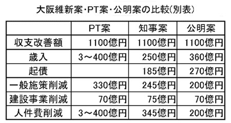 | 橋下徹知事は5日、今年度1100億円の収支改善を図る大阪維新プログラム案を発表しました。歳出削減額は665億円。内訳は一般施策経費245億円、建設事業費75億円、職員人件費345億円。残り435億円は、歳入確保と起債(退職手当債)を充当する最終案(以下表)です。全容は大阪府ホームページに掲載されていますからご覧ください。 就任からわずか4ヶ月というスピードでこれだけのボリュームの見直し行ったことは高く評価します。しかし、大阪維新案の大部分は「削減」が占め、府民の負担を求めていますが、「削減の改革」の先にどのような将来像があるのかが示されていません。 削減を回避するには、歳入の確保が重要です。今回の大阪維新案では、@府有財産の売却、A市町村施設整備貸付金の繰上償還、B各種基金の活用、C出資法人への貸付金の繰上償還や財産売却、D自動販売機設置にかかる公募の実施をあげています。 私が提案した府有地の売却(151億円)、自販機設置の公募(5億円)が今年度の歳入案に明記されましたが、景気に左右されやすい法人2税に依存する府の体質から脱皮するには、徹底した歳出削減とともに、税収だけに頼らず民間企業の発想で、全府庁が新たな歳入を確保する努力をしなければなりません。 また、今回の削減案の大半が一律カットです。私立学校の経常費助成は小中学校25%、高校10%、幼稚園5%の削減です。 高校授業料では最低32万4000円から最高90万円の格差があります。保護者負担を軽減するため運営努力で授業料を低く抑えている学校への評価をせずに一律カットするのは、今回の見直しの基準である「費用対効果」から妥当とはいえません。私学は運営費の約3割を経常費助成に頼っており授業料値上げや募集規模縮小につながります。 職員人件費削減は議員歳費も含め当然行わなければなりません。知事30%、特別職18〜20%、管理職12〜16%、非管理職4〜10%と一律カットです。特に医師不足のなかでの一律カットは、更に保健所や府立病院の医師不足に拍車をかけるでしょう。 知事が能力評価主義を主張するなら、一律カットでなく、評価基準を明確にして府民にも理解を求めるべきです。給与カットだけでなく、職員数削減や50億円を超える特殊勤務手当の見直しも必要です。その他にも高齢者事業など府民生活に影響のでる多くの削減があり、7月臨時府議会がヤマ場です。