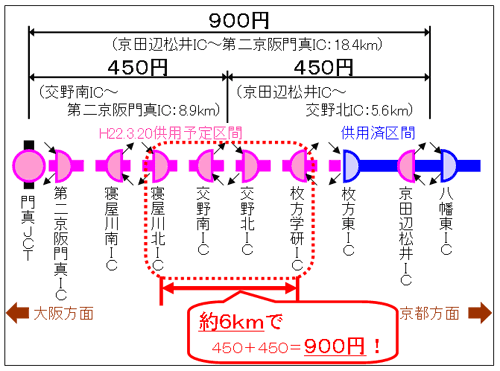 | 第2京阪道路を使い大阪市内に行く場合、平成18年に公表された料金は、第2京阪道路枚方学研ICから門真JCT間が900円、近畿自動車道の門真JCTから東大阪JCT間が連続利用の割引を適用して250円、阪神高速道路東大阪ランプから市内まで700円、合計1850円の高速道路料金がかかります。 一方、阪神高速守口ランプから乗れば、市内まで700円ですみます。片道1150円の差額は、毎日通勤で利用する北河内地域の市民からみると負担が大き過ぎます。 今回供用される枚方東IC〜門真JCT間では、均一区間料金制を導入しており、枚方学研ICから寝屋川北ICまではわずか6qで900円かかります。《下図1》 |