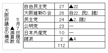 | 橋下徹府知事が代表となる「大阪維新の会」という“橋下政党“を4月19日に立ち上げました。橋下新党には、大阪府議会24人、大阪市議会1人、堺市議会5人が参加しました。(さらに5月7日に府議会自民党から2人が参加) 橋下知事は、大阪府と大阪市の再編を目的とする「大阪都構想」を主張されていますが、府と市の二重行政の解消など理解できるものがある反面、具体的な政策を示されているのが少なく実現できるのか首をかしげるものもあり、読者の皆さんが、「大阪都構想」を判断して頂くために、わかる範囲で検証しましたので参考にしてください。