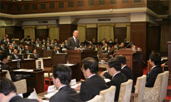 ![]() 【写真】本会議場で質問する鈴木。右端が橋 下知事 |