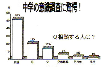 | 「いじめ問題を含め悩みがあった時にはどのように解決したのでしょうか?」の質問に、「先生に相談する」が わずか1%です。 友達が54%、母22%、父15%と比較しても先生への信頼感が少なすぎます。 学校での悩みを先生に相談できなくて何のための教育現場か。 それでは学校は学問だけを教えるところでしょうか。 その授業についても「授業でわからないところはどうしましたか?」には友達に聞いた45%、先生に聞いたが 17%の回答です。 もはや授業でも「教師」として見ていないのではないかという数字です。 生徒の先生に対する信頼は大変うすいといえます。 学校の管理体制よりも一人一人の先生の熱風・熱血気質が生徒の気質を変えていくと考えます。 |