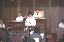 | 府議会では議員全員が議場に集まって開かれる会議を本会議といいます。議会の最終的な意思決定を行う会議です。 7月4日の府議会本会議場。この日は午後1時から民主党の代表質問。私にとって5月29日の本会議で102代副議長に全会一致で選出され、議長席から初めての議事進行です。 |