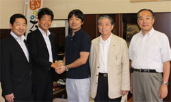 ![]() 参院選の当選翌日から、精力的に挨拶回りを 行う石川博崇氏。 橋下府知事とも意見交換(12日知事室) |