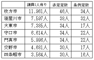 | 議会改革のなかで、議員定数削減が焦点になっていますので、22年10月号に引き続き検証します。議員定数は、地方自治法(90、91条)で、自治体の人口に応じて「法定人数」を設定しています。 市議会は、人口5万人未満から250万人まで11区分。たとえば、人口5万人未満は26人。同5万人以上10万人未満の市は30人。同10万以上20万未満、34人。同20万以上30万未満、38人。同30万以上50万未満、46人。同50万以上90万未満56人と定めています。町村議会は2000人未満から2万人以上までの5区分です。 都道府県議会は、75万人未満から618万人以上の9区分で、大阪府議会は120人です。 それぞれの自治体が、「法定人数」を上限に、条例で「議員定数」を定めることができると規定しています。 地元の北河内7市の議員条例定数(別表1)を示しました。1議員当たりの人口は、枚方市と四条畷市を比較すれば3.3倍の開きがあります。